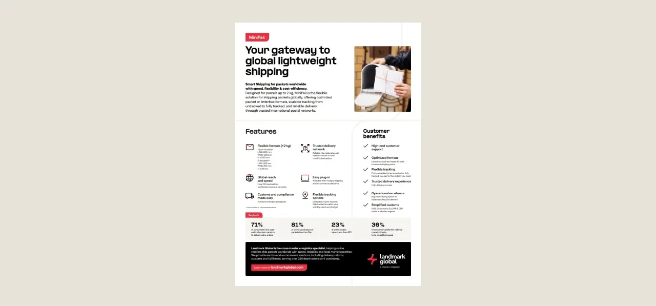 Diseñado para paquetes de hasta 2 kg, MiniPak ofrece formatos optimizados, seguimiento escalable desde sin seguimiento hasta seguimiento completo y entrega fiable a través de redes postales internacionales de confianza.