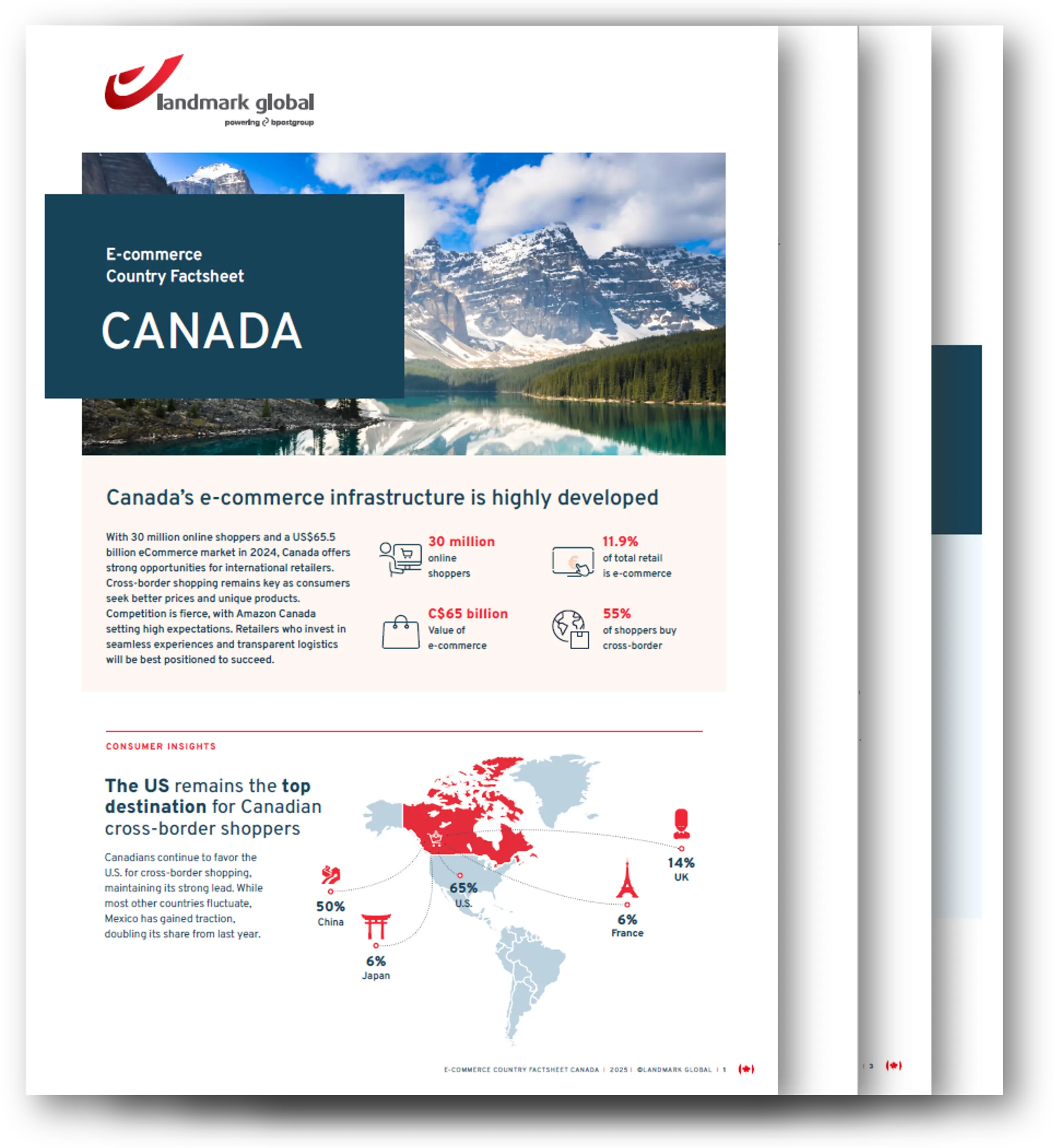 Parce que le Canada combine un fort pouvoir d’achat, 30 millions d’acheteurs en ligne, 65 milliards C$ de ventes e-commerce et un taux exceptionnel de 55 % d’achats transfrontaliers, ce qui en fait l’un des marchés les plus accessibles et rentables au monde.